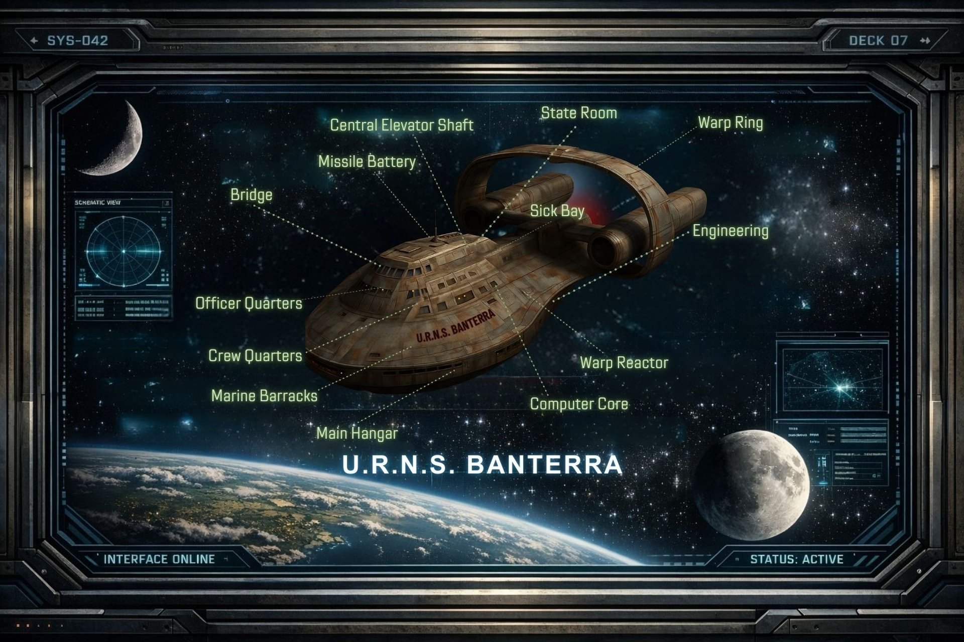 URNS Banterra. Indefatigable-class. Hull number CRS-1241. Coffman Memorial Shipyard, Earth. Launched March 10, 2177. Union Republic of Star Systems.